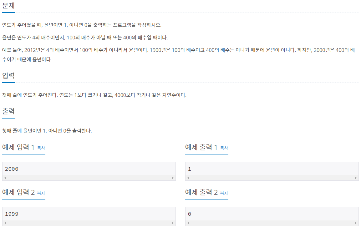 연도가 주어졌을 때, 윤년이면 1, 아니면 0을 출력하는 프로그램을 작성하시오. 윤년은 연도가 4의 배수이면서, 100의 배수가 아닐 때 또는 400의 배수일 때이다. 예를 들어, 2012년은 4의 배수이면서