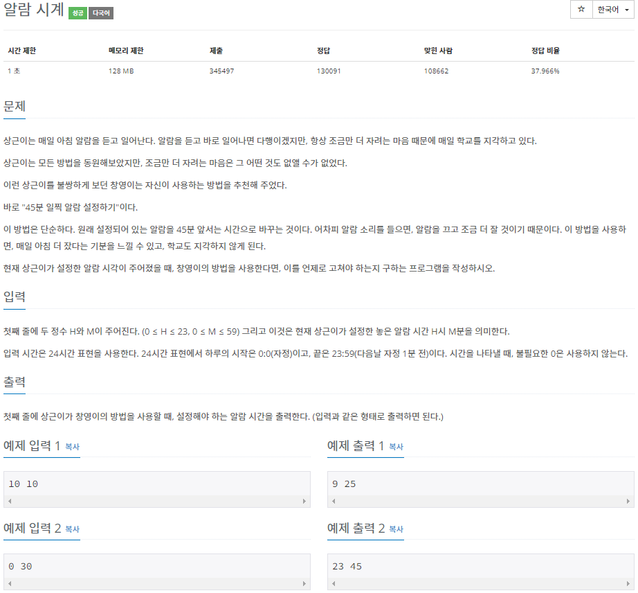 45분보다 적으면 시간을 -1을 해주고 적지 않으면 그대로 입력받는 시간에 -45 를 해주면 된다.
