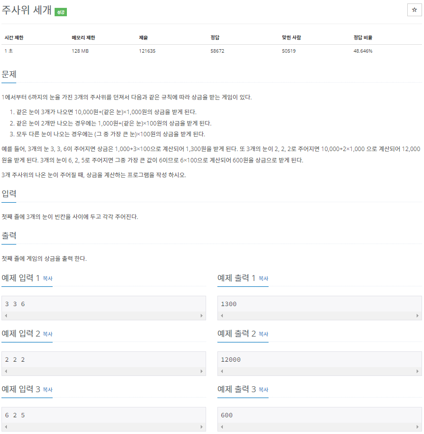 if(A == B && A == C) { // 3개다 같을 경우 10000 + (같은눈) x 1000