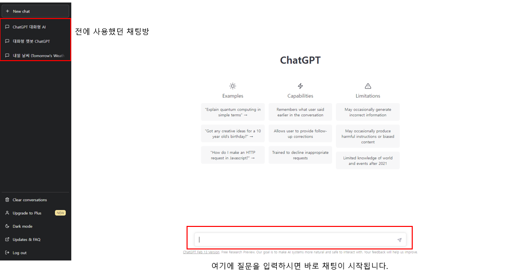 좌측 메뉴 항목에는 새로운 채팅만들기, 이전 대화방 기록들과