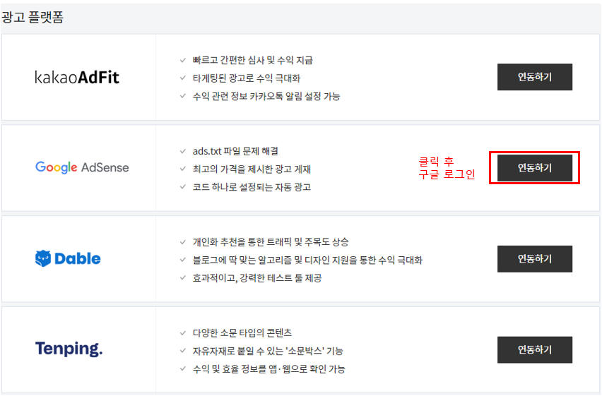 2. 구글 애드센스 연동하기 버튼 클릭 후 구글 로그인을 하시면 간단하게 연동 끝입니다.