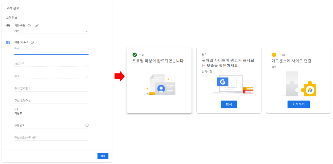 가입을 진행 후 메인 홈화면에서 귀하에 대한 정보를 입력하세요 , 애드센스에 사이트 연결 를 진행해 줍니다.