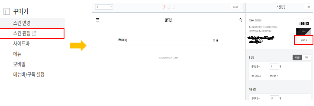 코드 복사 후 티스토리 블로그 관리 -> 스킨 편집으로 들어가 주시면 됩니다.