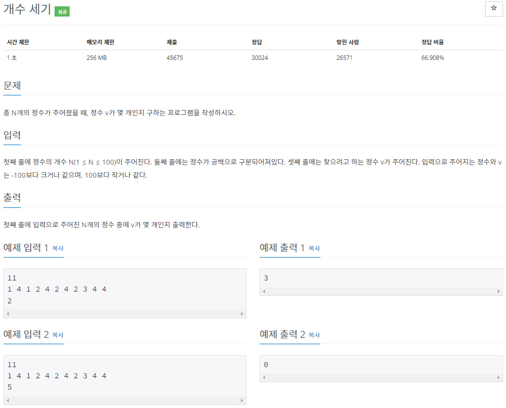 첫째 줄에 정수의 개수 N(1 ≤ N ≤ 100)이 주어진다. 둘째 줄에는 정수가 공백으로 구분되어져있다. 셋째 줄에는 찾으려고 하는 정수 v가 주어진다. 입력으로 주어지는 정수와 v는 -100보다 크거