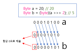 | a >>> b | a의 각 비트를 오른쪽으로 b번 시프트 한다. 그리고 최상위 비트의 빈자리는 0으로 채운다. 논리적 오른쪽 시프트라고 한다. |