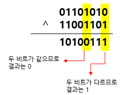 | a ^ b | a와 b의 각 비트들의 XOR 연산. 두 비트가 서로 다르면 1, 같으면 0이다. |