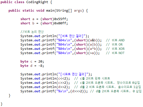 | ~ a | 단항 연산자로서 a의 각 비트들에 NOT 연산. 1을 0으로, 0을 1로 변환한다. |
