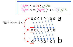 | a >> b | a의 각 비트를 오른쪽으로 b번 시프트 한다. 최상위 비트의 빈자리는 시프트 전의 최상위 비트로 다시 채운다. 산술적 오른쪽 시프트라고 한다. |