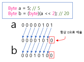 | a << b | a의 각 비트를 왼쪽으로 b번 시프트 한다. 그리고 최하위 비트의 빈자리는 0으로 채운다. 산술적 왼쪽 시프트 라고 한다. |