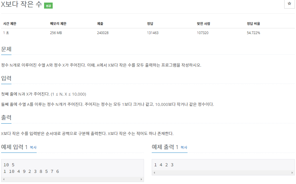 [백준] 10871번 : X보다 작은 수 - JAVA 배열