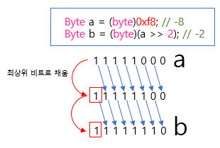 | a >> b | a의 각 비트를 오른쪽으로 b번 시프트 한다. 최상위 비트의 빈자리는 시프트 전의 최상위 비트로 다시 채운다. 산술적 오른쪽 시프트라고 한다. |