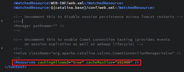 추가 : <Resources cachingAllowed="true" cacheMaxSize="102400" />
