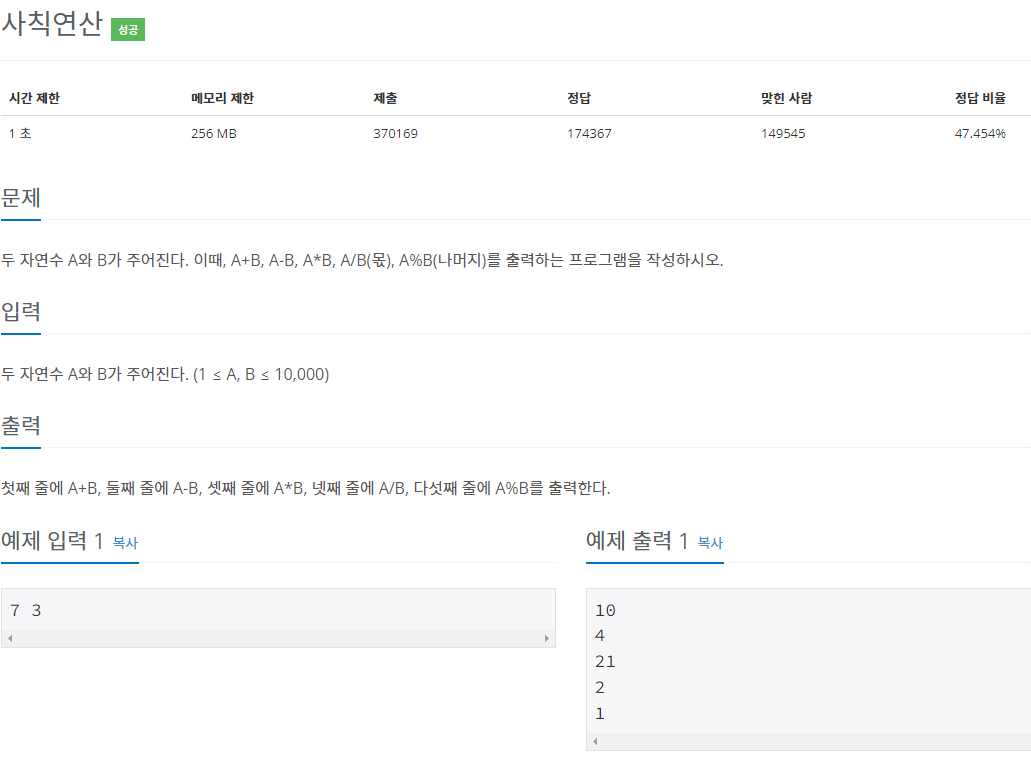 두 자연수 A와 B가 주어진다. 이때, A+B, A-B, A*B, A/B(몫), A%B(나머지)를 출력하는 프로그램을 작성하시오.